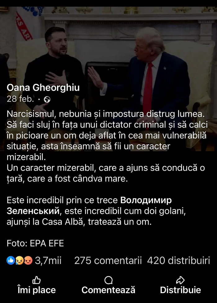 Este incredibil prin ce trece Володимир зеленський, Volodimir Zelenski este incredibil cum doi golani, ajunşi la Casa Albă, tratează un om”, a scris Oana Gheorghiu la acea vreme.