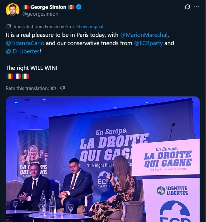 La Paris, George Simion, vicepreședintele ECR, își oferă sprijinul pentru dreapta franceză și a susținut nevoia colaborării între forțele de dreapta și cele conservatoare.