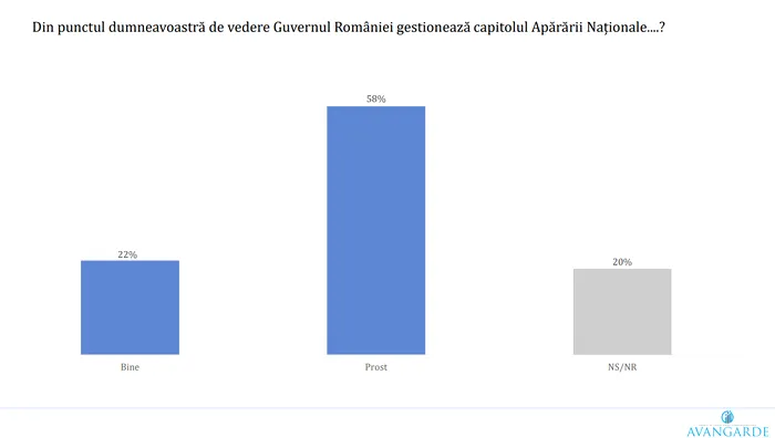 La capitolul încrederii în Executiv, cifrele arată o lipsă de încredere: 58% dintre respondenți consideră că Guvernul gestionează prost sectorul apărării, doar 22% oferind un calificativ pozitiv. Alți 20% dintre români au evitat să se pronunțe.