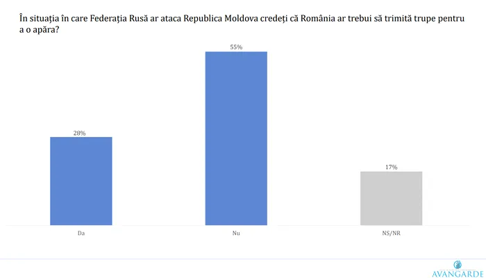 În eventualitatea unui atac al Rusiei asupra Republicii Moldova, 28% dintre români cred că România ar trebui să trimită trupe, în timp ce 55% se opun categoric. Doar 17% sunt indeciși.