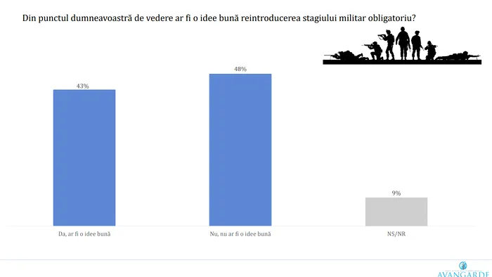 Chestionați dacă ar trebui reintrodus stagiul militar obligatoriu, 48% au răspuns negativ, în timp ce 43% au afirmat că ar fi o idee bună.