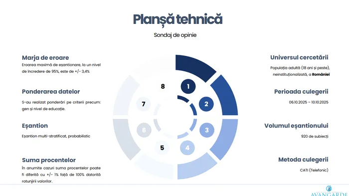 Sondajul a fost realizat pe un eșantion de 920 de persoane și este reprezentativ pentru populația adultă. Marja de eroare este de ±3,4%, la un nivel de încredere de 95%. Intervievarea a avut loc telefonic, în perioada 6–10 octombrie 2025.
