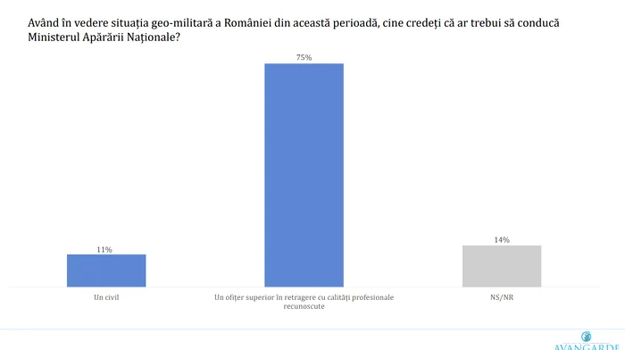 75% dintre români cred că Ministerul Apărării Naționale ar trebui condus de un ofițer superior în retragere, cu experiență profesională recunoscută. 11% preferă un civil, iar 14% nu au o opinie.