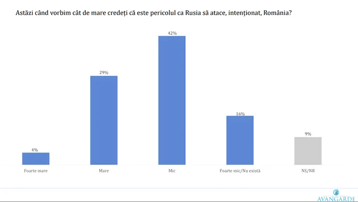 O treime dintre români consideră că pericolul ca România să fie atacată de Rusia este mare sau foarte mare, iar un total de 58% au apreciat că pericolul este mic sau foarte mic/inexistent.