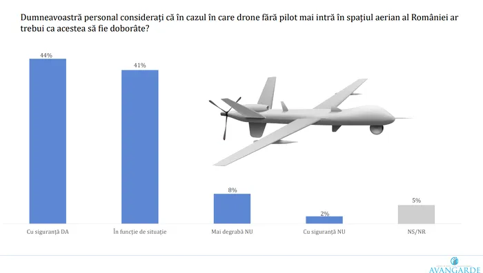 În ce privește dronele care încalcă spațiul aerian al României, 44% dintre respondenți cred că acestea ar trebui „cu siguranță” doborâte, iar alți 41% susțin o decizie „în funcție de situație”. Doar 10% au dat un răspuns negativ