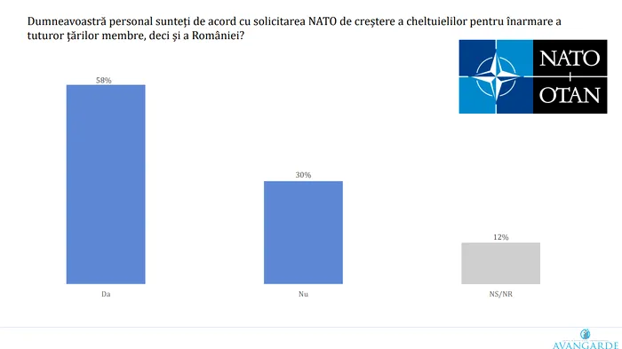 Cu creșterea cheltuielilor pentru înarmare a tuturor țărilor membre ale NATO, deci și a României, sunt de acord 58%, 30% nu sunt de acord, iar 12% evită un răspuns.
