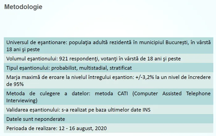 Trebuie precizat că ”universul de eșantionare” a fost reprezentat de populația adultă, rezidentă în București, în vârstă de 18 și peste, la întrebări răspunzând 921 de persoane.