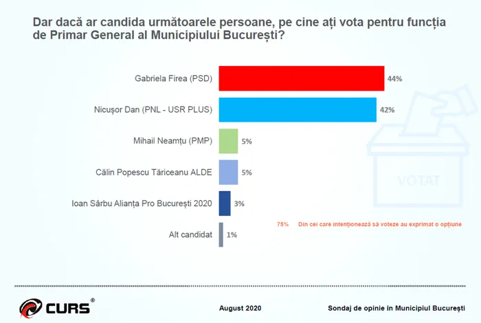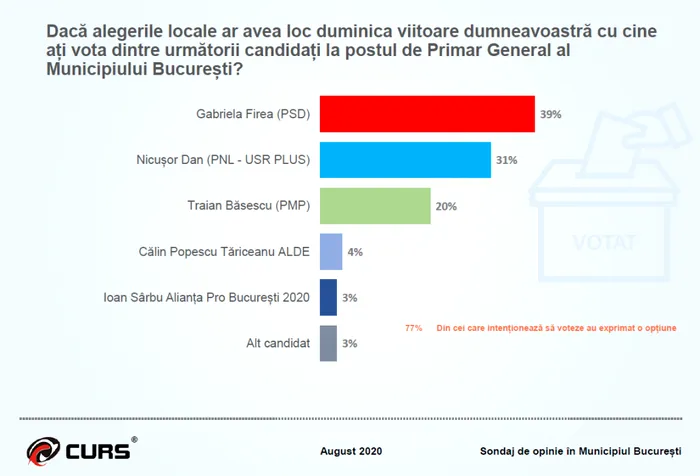 Gabriela Firea (PSD) este creditată cu prima șansă, în momentul de față – 39 % dintre respondenți au declarat că ar vota cu ea dacă alegerile ar avea loc duminica viitoare -, iar Nicușor Dan (PNL – USR PLUS) se poziționează pe locul al doilea, 31 % dintre respondenți afirmând că l-ar vota pentru funcția de Primar General al Capitalei.