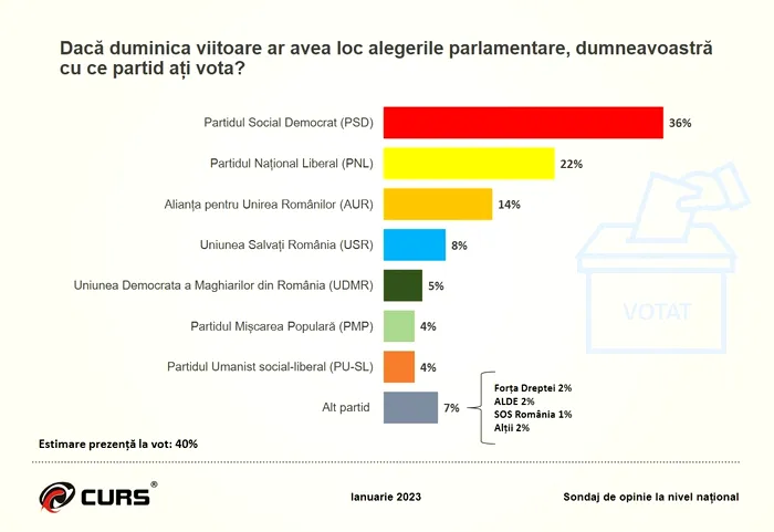 Centrul de Sociologie Urbană și Regională (CURS) a realizat în perioada 10-20 ianuarie 2023 un sondaj de tip omnibus, iar rezultatele plasează PSD pe primul loc.