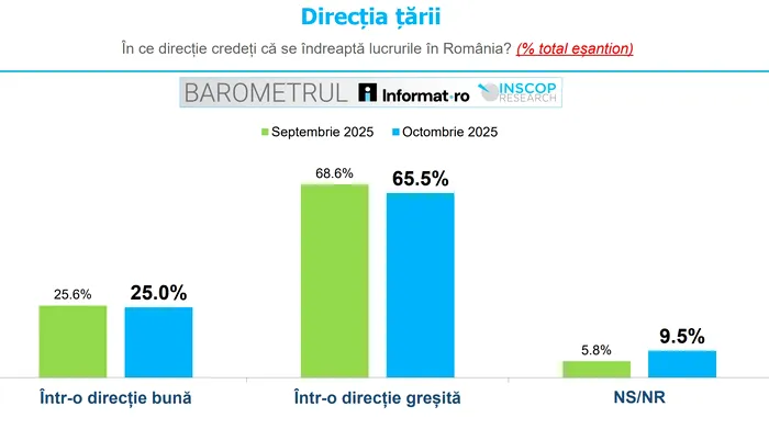 65.5% dintre români sunt de părere că lucrurile merg într-o direcție greșită, în timp ce doar 25% cred că lucrurile în România se îndreaptă într-o direcție bună.