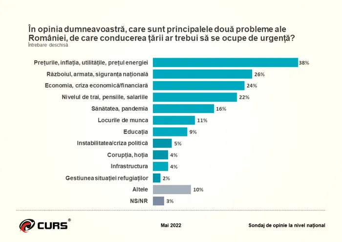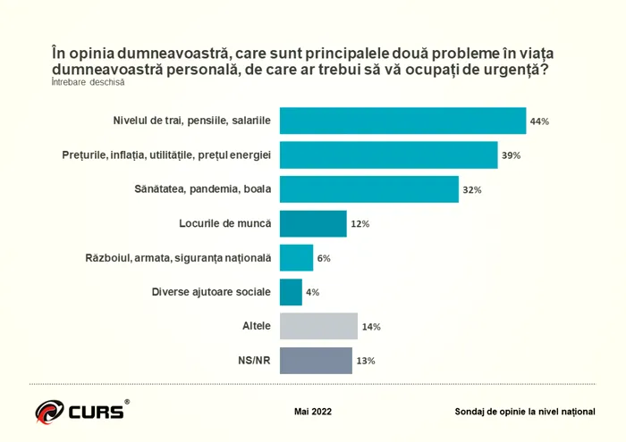 Participanții la sondaj și-au exprimat părerea și cu privire la direcție în care merge România, la principalele probleme ale țării, care ar trebui rezolvate de urgență de autorități, dar și problemele personale de care ar trebui să se ocupe cât de repede.