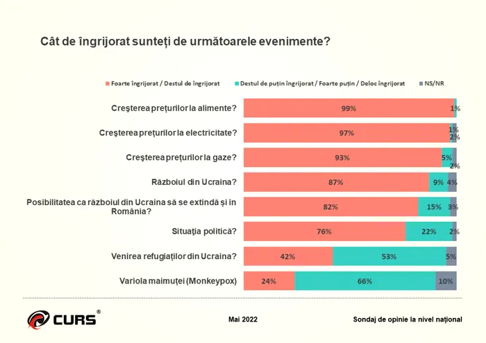 Conform respondenților, creșterea prețurilor la alimente este cea mai îngrijorătoare situație în prezent (99%), urmată de cea a prețurilor la electricitate.