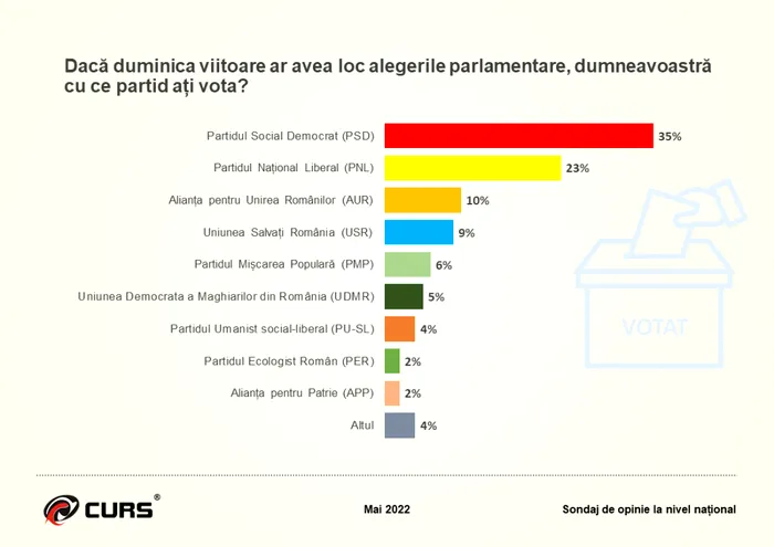 PSD a scăzut un procent față de martie-aprilie și e la același nivel, de 35%, ca în sondajul CURS din luna martie.