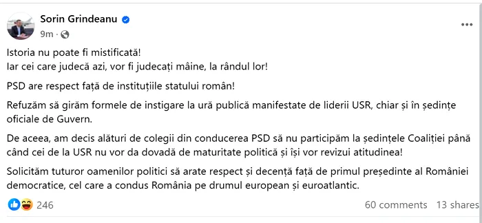 „Istoria nu poate fi mistificată!Iar cei care judecă azi, vor fi judecați mâine, la rândul lor!PSD are respect față de instituțiile statului român!Refuzăm să girăm formele de instigare la ură publică manifestate de liderii USR, chiar și în ședințe oficiale de Guvern.De aceea, am decis alături de colegii din conducerea PSD să nu participăm la ședințele Coaliției până când cei de la USR nu vor da dovadă de maturitate politică și își vor revizui atitudinea!Solicităm tuturor oamenilor politici să arate respect și decență față de primul președinte al României democratice, cel care a condus România pe drumul european și euroatlantic”, este mesajul liderului interimar al PSD postat pe Facebook.