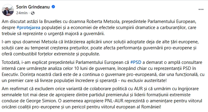Președintele PSD, Sorin Grindeanu, a postat un mesaj pe pagina sa de Facebook, prin intermediul căruia a anunțat ce discuții a purtat la Buxelles cu Roberta Metsola, președintele Parlamentului European.