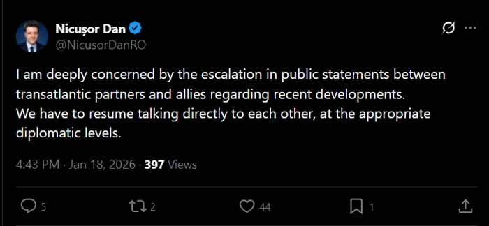 Președintele Nicușor Dan a transmis un mesaj în care își manifestă „îngrijorarea”, în contextul tulburărilor din politica externă generate de inițiativa SUA de a prelua Groenlanda.