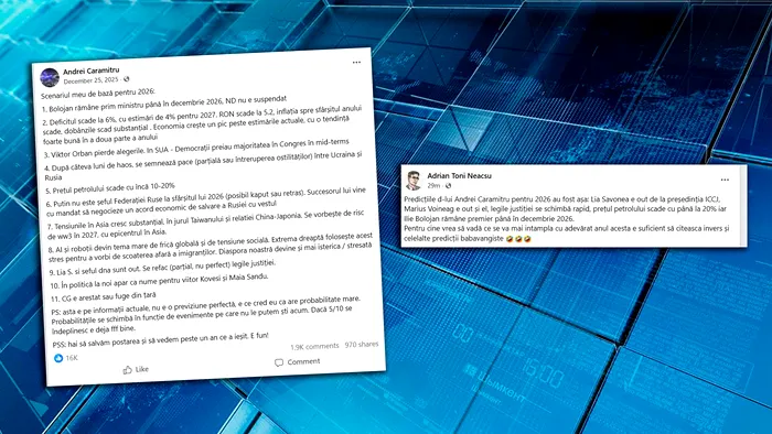 Într-o postare de pe Facebook, avocatul Adrian Toni Neacșu râde de predicțiile analistului Andrei Caramitru pentru anul 2026. Avocatul i-a caracterizat predicțiile ca fiind „babavangiste” și le-a sugerat internauților să le citească „invers”.