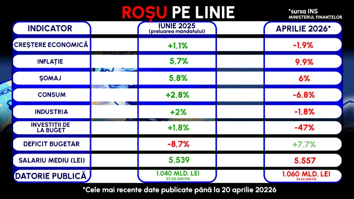În economie, cifrele sunt sumbre, potrivit INS. Inflația a crescut de la 5,7% în iunie 2025 la 9,9% în aprilie 2026. Iar șomajul s-a mărit de la 5,8% în iunie 2025 la 6% în aprilie 2026.