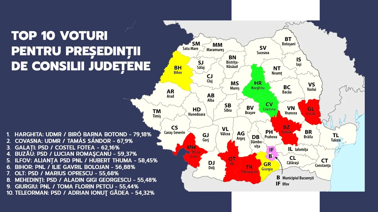 Iată o analiză detaliată a primilor 10 președinți de consilii județene, potrivit rezultatelor oficiale parțiale.