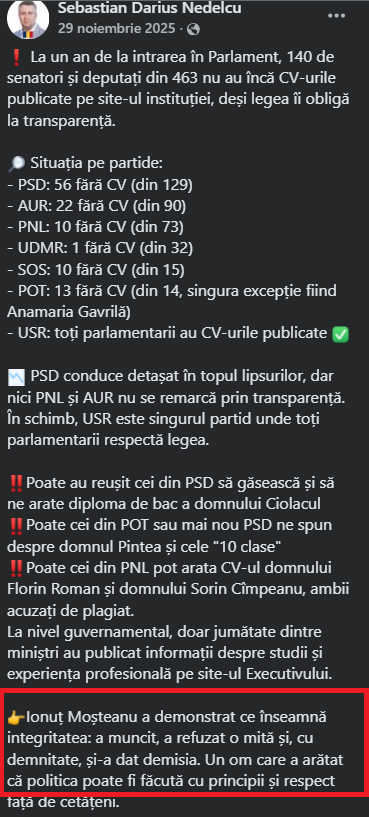 „Ionuț Moșteanu a demonstrat ce înseamnă integritatea: a muncit, a refuzat o mită și, cu demnitate, și-a dat demisia. Un om care a arătat că politica poate fi făcută cu principii și respect față de cetățeni”, a scris el pe Facebook.