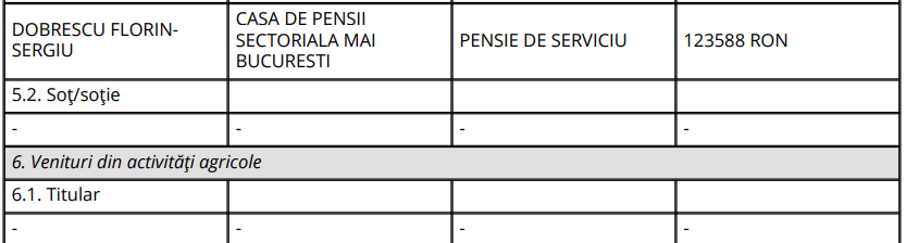 În 2025, acesta era subprefect al municipiului Brăila, și figura cu o pensie specială de 10.299 lei, aproximativ 2000 de euro, dar și cu o indemnizație lunară de 9.700 lei de la Ministerul Muncii, Familiei, Tineretului si Solidaritatii Sociale, potrivit declarației de avere. Per total, Florin Sergiu Dobrescu figura, anul trecut, cu un venit de aproximativ 4000 de euro pe euro.