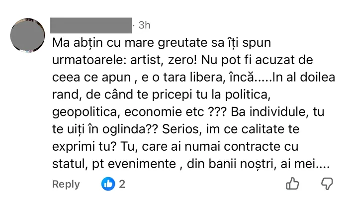 „Ma abţin cu mare greutate sa îți spun urmatoarele: artist, zero! Nu pot fi acuzat de ceea ce spun, e o tara libera, încă…..În al doilea rand, de când te pricepi tu la politică, geopolitică, economie etc ??? Bă, individule, tu te uiți în oglindă?? Serios, în ce calitate te exprimi tu? Tu, care ai numai contracte cu statul, pt evenimente, din banii noștri, ai mei….” spune unul dintre utilizatori.