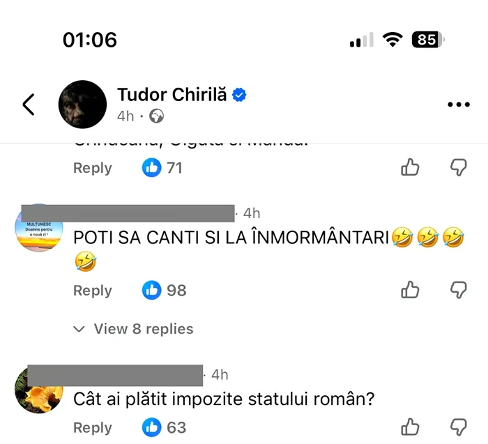 Unii utilizatori fac haz de necaz și sunt mai degrabă ironici la adresa lui Tudor Chirilă. „Poți să cânți la înmormântări”, îi transmite cineva, în glumă, ca o aluzie la plata dărilor către stat.