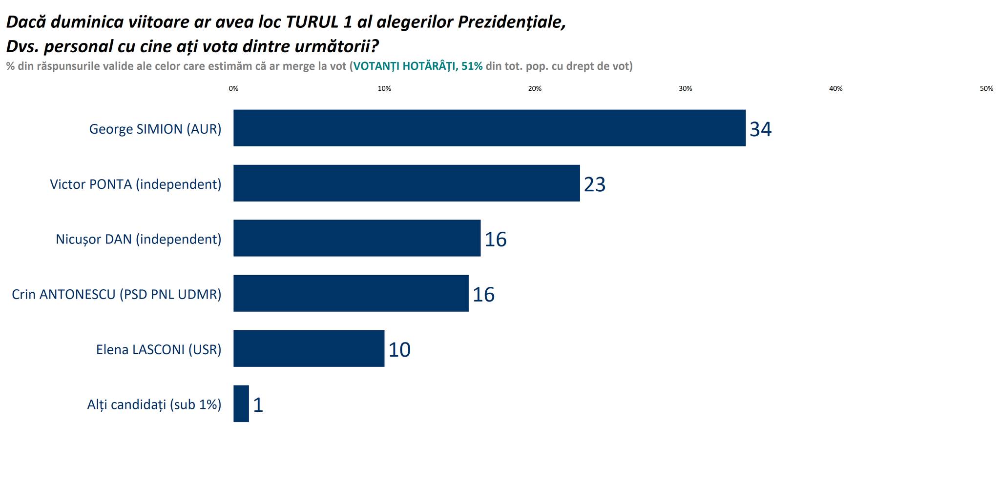 „Ceilalți candidați obțin scoruri foarte mici, sub 1%, în valoare totală cumulată de 1%. Participarea la vot estimată în țară este de 51%. În concluzie, dacă duminica viitoare ar fi turul unu al alegerilor prezidențiale, în finala turului doi s-ar califica George Simion împreună cu Victor Ponta.