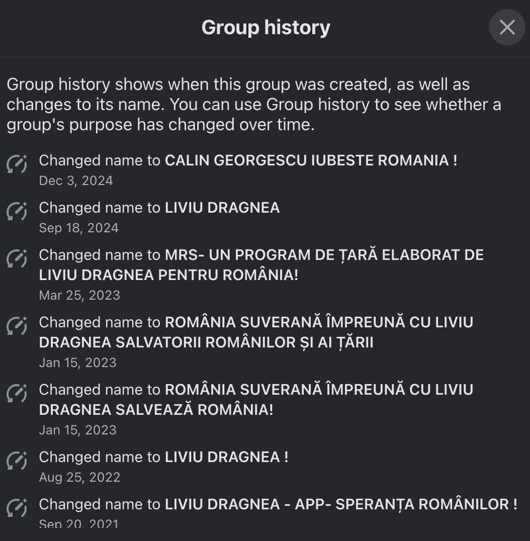 Conform unei investigații realizate de Gândul, schimbarea de denumire a fost făcută pe 3 decembrie 2024, grupul ajungând să se intituleze „Călin Georgescu iubește România”, adunând deja peste 29.000 de membri.