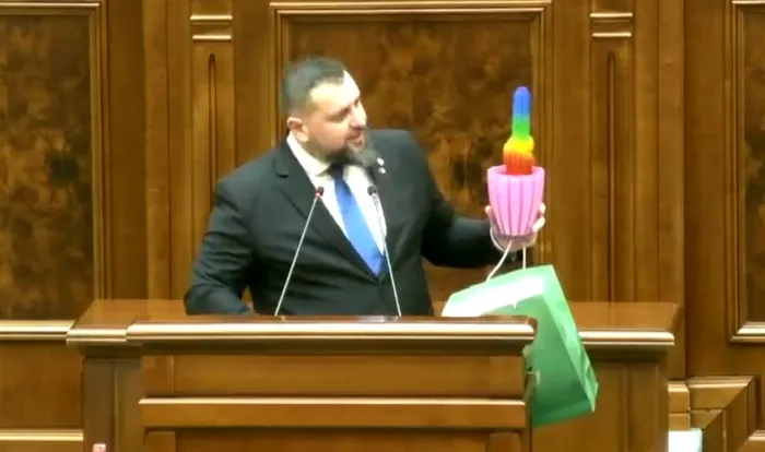 Moment comic, luni după-amiază, la Parlament. Senatorul AUR Ștefan Geamănu a venit cu un cactus în culorile curcubeului și l-a dedicat celor de la USR.