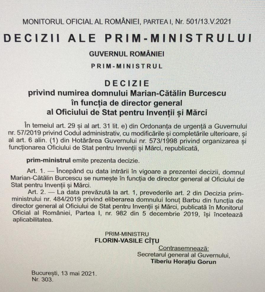 Decizia de numire în funcție a apărut deja în Monitorul Oficial, în data de 13 mai 2021, cu semnătura premierului Florin Cîțu.