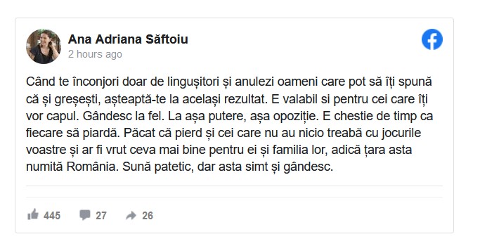 Sună patetic, dar asta simt și gândesc.”, scrie Adriana Săftoiu.