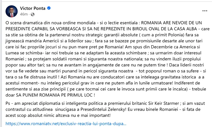 „O confruntare foarte dură. Nu mă miră. România nu are un lider care poate vorbi cu Trump. Am văzut o confruntare foarte dura și chiar e foarte important cine o să se duca sa vorbeasca cu Trump. Foarte dur a fost, e socant și pentru mine, dar nu mă miră. Mă miră că liderii români nu au înțeles și nu s-au pregătit. România nu are în acest moment un lider care sa poate sa discute cu Trump pe limba lui Donald Trump”, a declarat fostul premier pentru România TV.