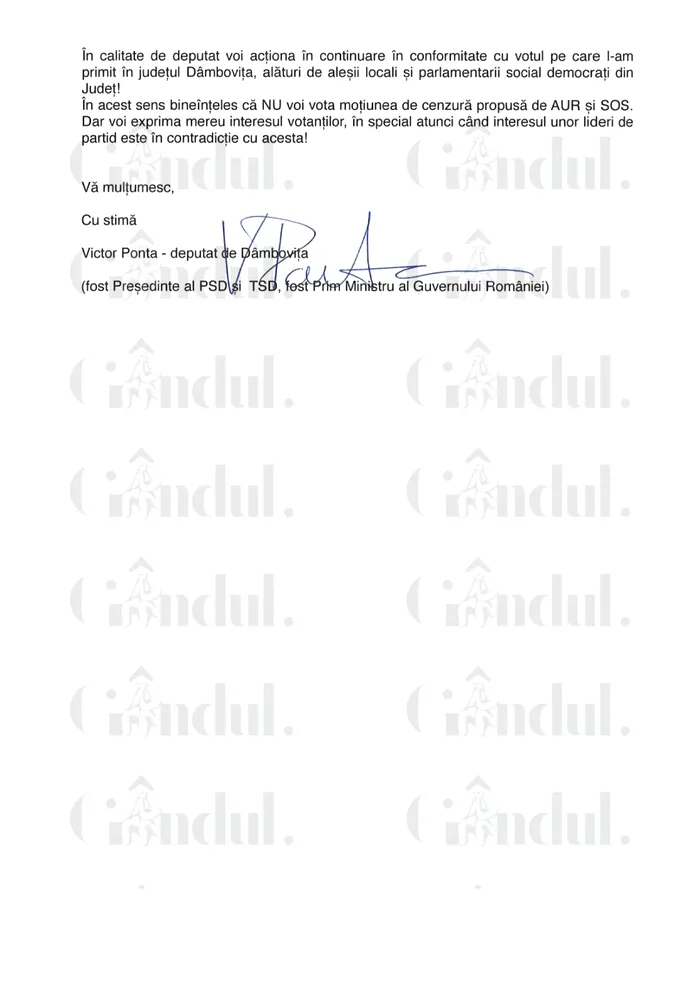 „Având în vedere situația actuală, în care există o contradicție evidentă între voința electoratului și deciziile luate de conducerile partidelor politice care formează coaliția de guvernare, mă văd nevoit să vă comunic, în mod formal, decizia mea”, transmite Ponta.
