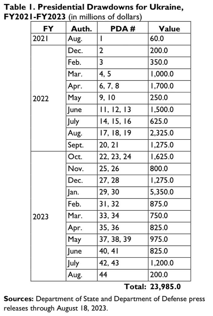 Din 2014, când Rusia a invadat pentru prima dată Ucraina, până la 22 august 2023, Statele Unite au acordat peste 46 de miliarde de dolari în asistență de securitate „pentru a ajuta Ucraina își păstrează integritatea teritorială, își asigură granițele, și îmbunătățirea interoperabilității cu NATO”, potrivit Departamentul de Stat. Din această sumă, Biden Administrația a angajat peste 43 de miliarde de dolari asistență de securitate din februarie 2022, se arată într-un document al Congresului american.