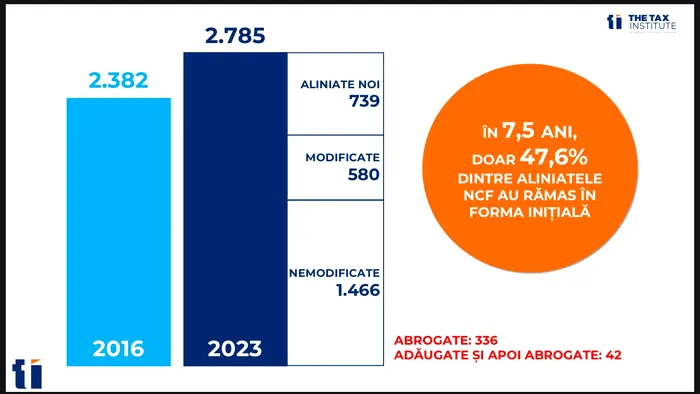 The Tax Institute, condus de avocatul Gabriel Biriș, a lansat primul studiu care inventariază modificările aduse legislației fiscale în perioada 2015 – 2023. Conform raportului, doar 47,6% din alineantele Noului Cod Fiscal, aprobat prin Legea 227/2015, au mai rămas în forma inițială.