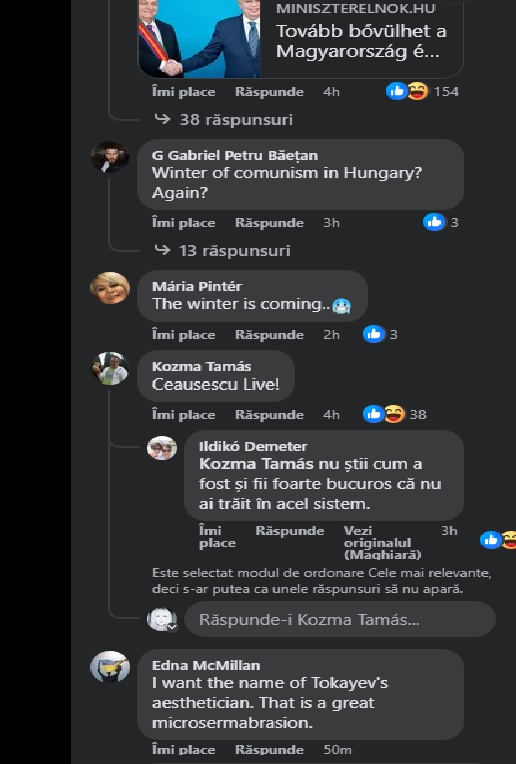 Postarea premierului ungar nu a rămas fără reacții pe Facebook. „Ceaușescu live” este unul dintre comentarii. „Nu știi cum a fost și fii foarte bucuros că nu ai trăit în acel sistem”, a venit și răspunsul.