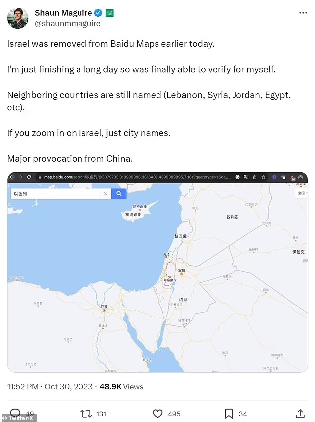 Jonathan Cheng, șeful biroului WSJ din China, a scris pe X că utilizatorii de internet chinezi „și-au exprimat nedumerirea că numele Israel nu apare pe hărțile digitale de la Baidu și Alibaba”.
