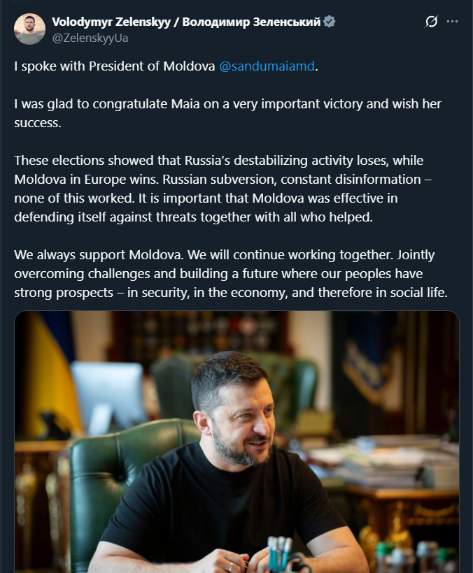 Am vorbit cu Președintele Republicii Moldova, Maia Sandu. Am fost bucuros să o felicit pe Maia pentru o victorie foarte importantă și să-i urez succes, scrie el pe X.