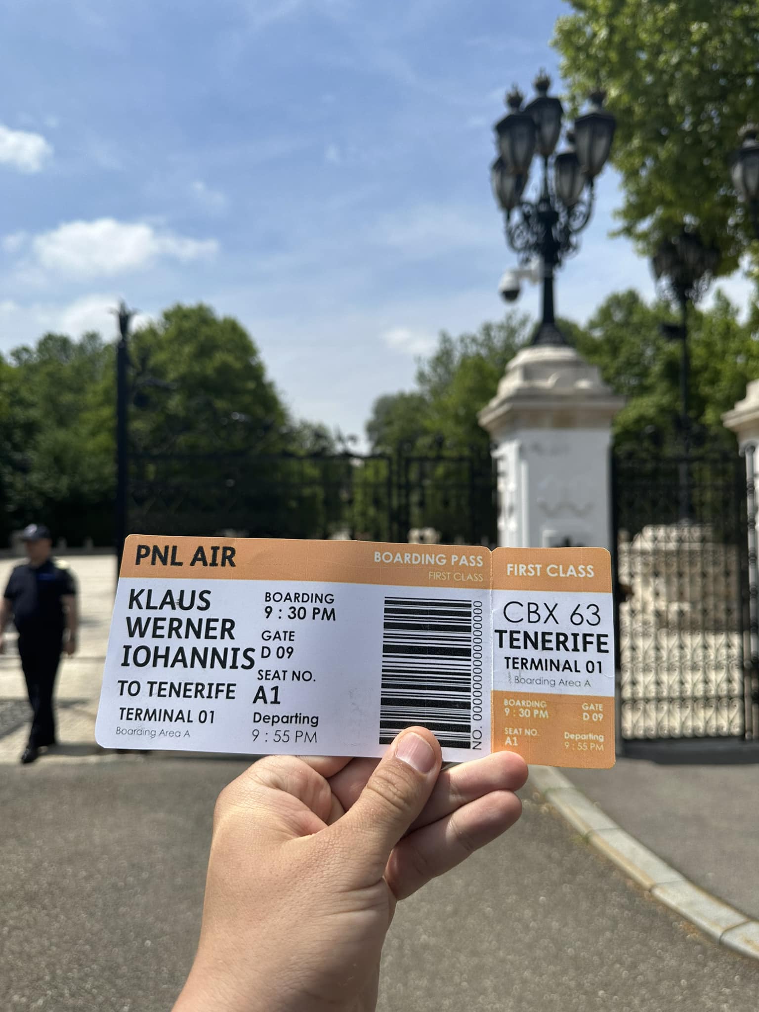 . Înainte să intre la întâlnirea, liderul AUR a postat pe Facebook o poză cu un bilet simulat pe numele lui Klaus Iohannis spre Tenerife, comentând „doar dus”.