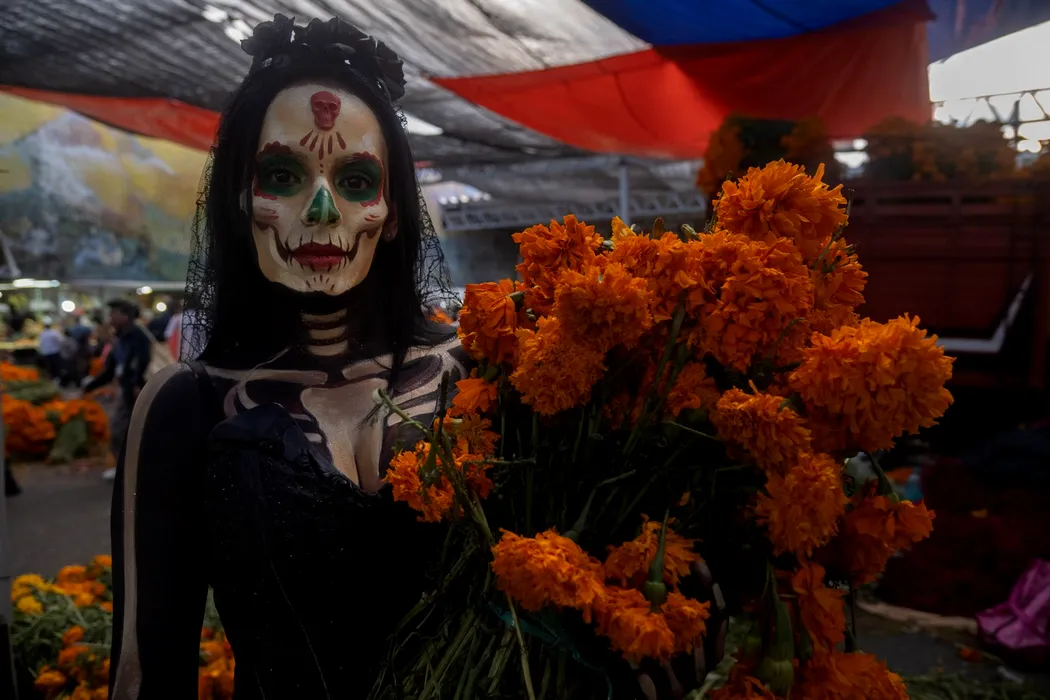 October 26, 2025, Mexico City, Cdmx, Mexico: A woman with her face painted like a skull holds cempasuchil flowers at the Jamaica market for the Day of the Dead celebrations. on October 26, 2025 in Mexico City, Mexico.,Image: 1048723114, License: Rights-managed, Restrictions: * Germany Rights Out *, Model Release: no, Credit line: Marco Gonzalez / Zuma Press / Profimedia