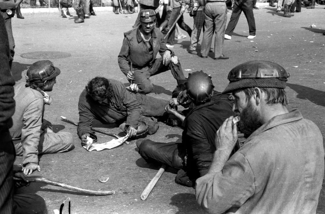 Mineri se odihnesc, in fata Palatului Victoria din Bucuresti, 15 iunie 1990. Evenimentele din perioada 13-15 iunie 1990 au marcat o perioada de disensiuni socio-politice majore. Mineriada din iunie '90 este considerata una dintre cele mai sangeroase actiuni ale minerilor, care, alaturi de fortele de ordine, au intervenit pentru a imprastia demonstrantii, aflati de 52 de zile in Piata Universitatii. VICTOR CIUPULIGA / MEDIAFAX FOTO