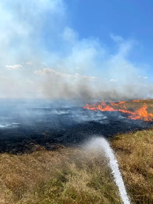 FOTO | 400 de hectare din Poligonul Babadag au luat foc în urma activităţilor executate de militari francezi. Zeci de pompieri au intervenit pentru stingerea incendiului