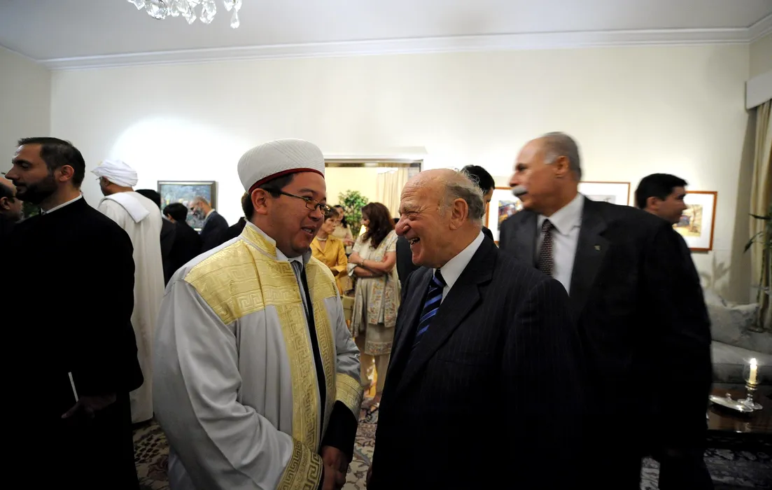Muftiul Muurat Iusuf (S), reprezentantul Muftiatului Cultului Musulman din Romania si Aurel Vainer (D), presedintele Federatiei Comunitatilor Evreiesti din Romania, participa la cina de Iftar ce marcheaza sfarsitul Ramadanului, la resedinta ambasadorului SUA, in Bucuresti, miercuri, 10 august 2011. RAZVAN CHIRITA / MEDIAFAX FOTO
