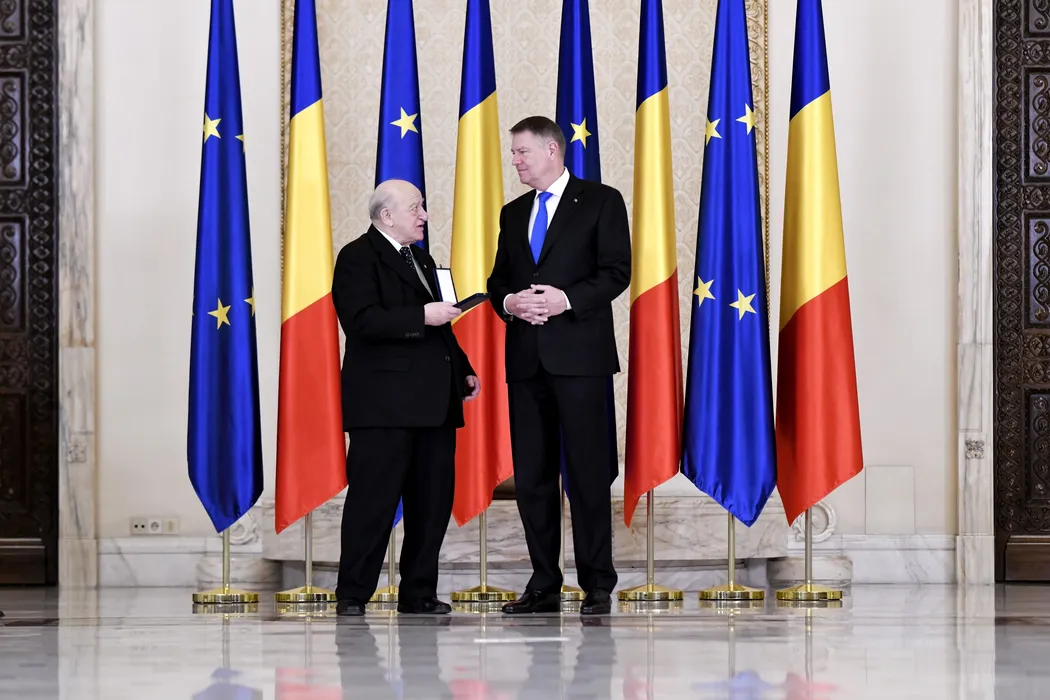 Presedintele Comunitatilor Evreiesti din Romania, Aurel Vainer (S), si presedintele Romaniei, Klaus Iohannis (D), discuta in timpul ceremoniei de decorare a unor entitati si a unor supravietuitori romi ai Holocaustului cu ocazia Zilei Internaionale de Comemorare a Victimelor Holocaustului si implinirii a 75 de ani de la eliberarea complexului de la Auschwitz-Birkenau, desfasurata in Sala Unirii a Palatul Cotroceni din Bucuresti, luni, 27 ianuarie 2020. ANDREEA ALEXANDRU / MEDIAFAX FOTO