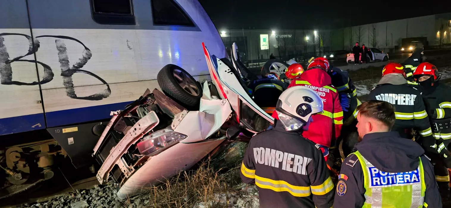 Accident feroviar grav în Chiajna. Un bărbat a rămas încarcerat după ce un autoturism a fost lovit de tren. Circulația feroviară este oprită