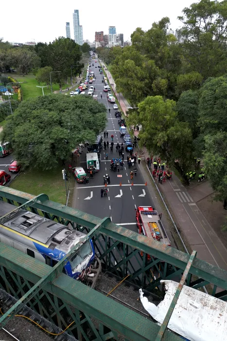Aerial view of emergency crew members working on a train crash site in Buenos Aires on May 10, 2024. A passenger train crashed into a maintenance train in Buenos Aires on May 10, leaving at least 30 people hospitalized, two of whom were in serious condition, emergency officials said.,Image: 871754804, License: Rights-managed, Restrictions: , Model Release: no