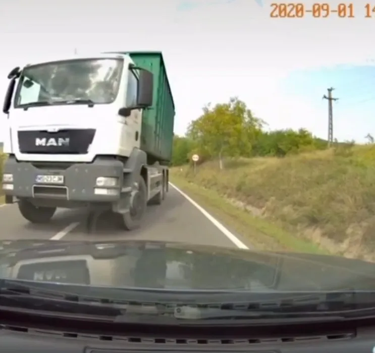 Accident grav, evitat în ultima secundă! Un TIR depășește într-o curbă fără vizibilitate (VIDEO) / Incident grav la o zi după accidentul ministrului Transporturilor, Lucian Bode