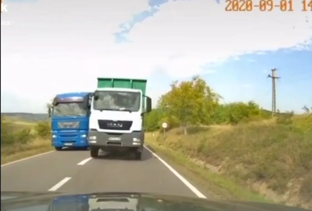 Accident grav, evitat în ultima secundă! Un TIR depășește într-o curbă fără vizibilitate (VIDEO) / Incident grav la o zi după accidentul ministrului Transporturilor, Lucian Bode