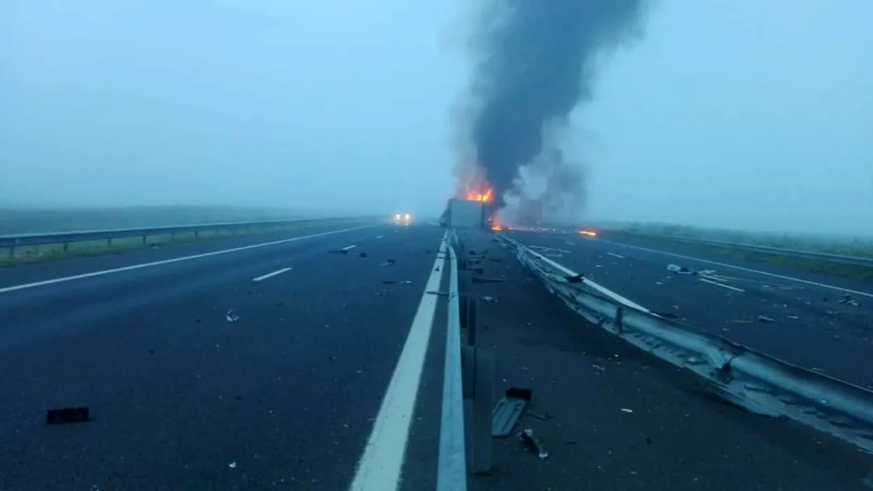 GALERIE FOTO: Accident grav în apropiere de Vama Nădlac. Un TIR s-a răsturnat și a fost cuprins de flăcări, după ce a lovit alte două camioane